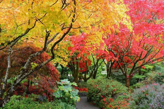 Khu vườn Nhật Bản với các tông màu xanh, vàng, cam, đỏ là màu chủ đạo cho Butchart vào thu, những tán cây rợp đỏ vùng trời khiến bạn khó mà kìm lòng trước cảnh vật hữu tình. Nếu bạn đang loay hoay tìm một địa điểm du lịch lãng mạn cùng “nửa kia” của mình thì còn khu vườn nào hợp hơn Butchart nữa.