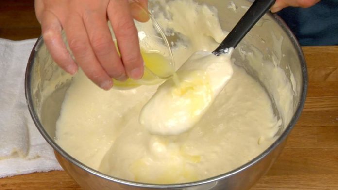 Bước 7: Bạn cho bơ và sữa đã tan chảy vào hỗn hợp và tiếp tục trộn theo phương pháp hất từ dưới lên trên khoảng 50 lần.