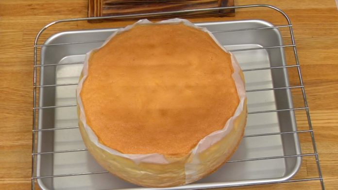 Bước 10: Khi bánh đã chín, bạn thả rơi bánh để bánh có thể tan hết bọt khí. Sau đó bạn tháo hết các lớp giấy nến lót phía dưới và xung quanh bánh ra.