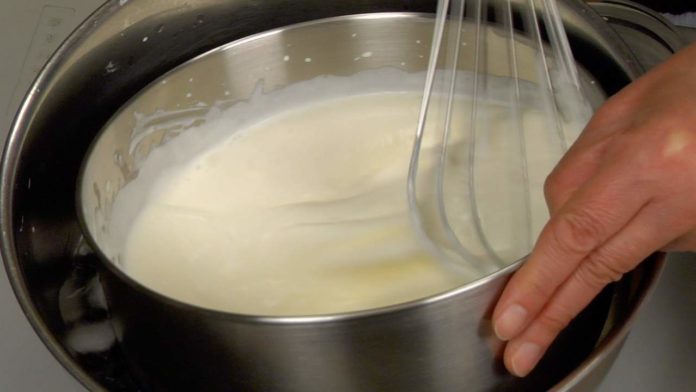 Bước 1: Thêm đường vào heavy cream, sau đó đặt lên trên một bát nước đá. Bạn dùng phới lồng đánh đều hỗn hợp kem cho tới khi tạo thành chóp cứng.
