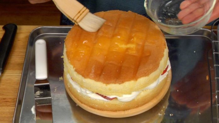 Bước 5: Úp phần bánh đã được thoa siro lên trên lớp dâu tây. Rồi tiếp tục thoa hỗn hợp siro lên mặt bánh trên cùng.