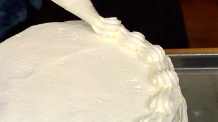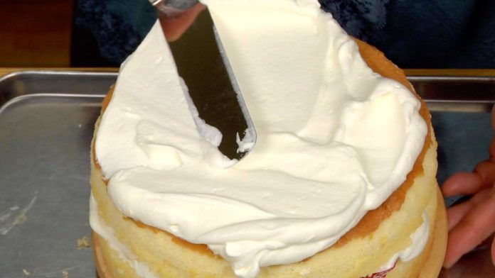 Bước 6: Bạn cho một lượng kem lớn lên trên mặt bánh. Tiếp đó vừa xoay bánh vừa trải đều kem lên khắp mặt bánh. Bạn phải đảm bảo rằng lớp kem sẽ che phủ hết các góc cạnh của bánh.