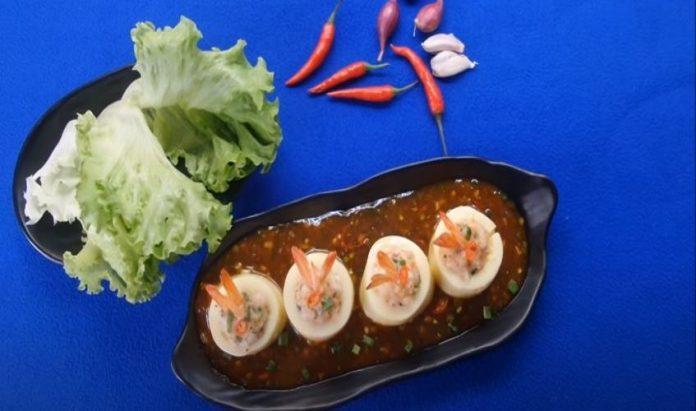 Bước 4: Nhồi hỗn hợp tôm vào miếng đậu hũ trứng và trang trí cho đẹp mắt bằng cách gắn đuôi tôm lên trên.Cho đậu hũ trứng tôm vào nồi, bắc lên bếp hấp chín trong vòng 10 phút.