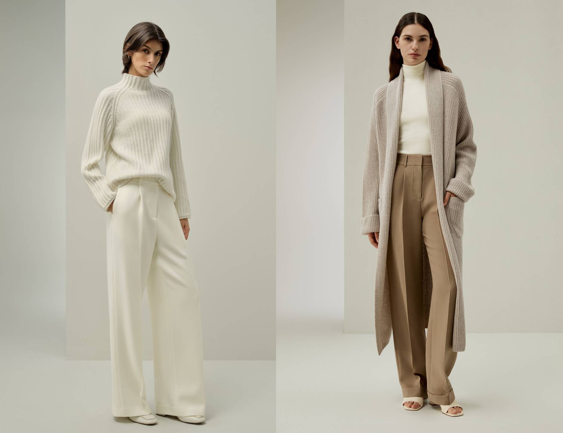 Áo cashmere có ưu điểm giữ ấm tốt, nhẹ, không gây ngứa và mang đến vẻ sang tự nhiên. Quần tây may đo giúp tạo phom gọn gàng và tôn dáng, cân bằng hoàn hảo với phần áo mềm rũ. Một đôi bốt cổ cao, túi xách chần bông hoặc túi da mềm sẽ nâng tầm tổng thể. Nếu muốn tạo điểm nhấn sang trọng, bạn có thể thêm vòng cổ ngọc trai, kính râm cổ điển – đơn giản nhưng cực kỳ hiệu quả.