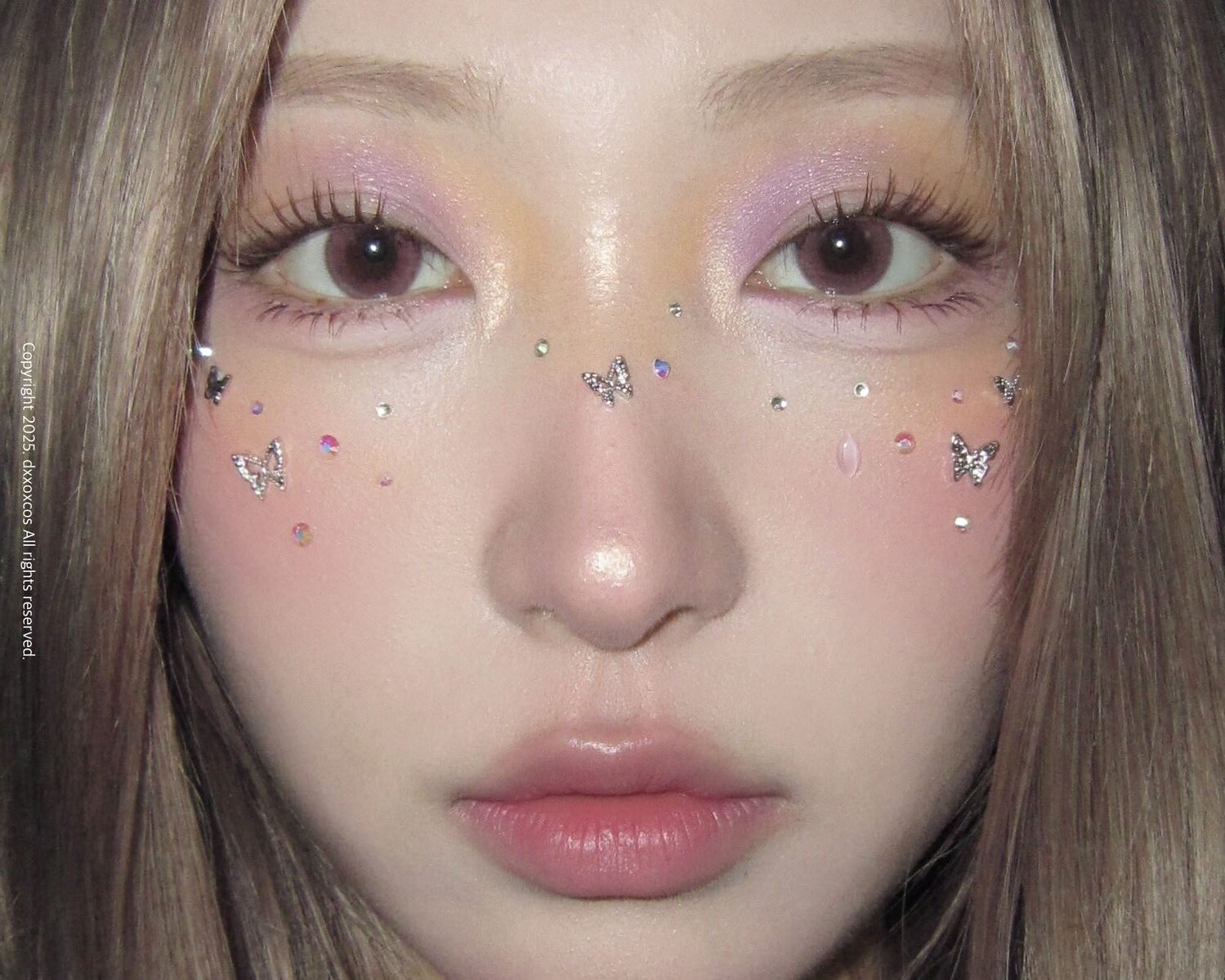 - Tone makeup: Tone tím lilac, hồng nhạt, nhũ sáng lấp lánh (holographic shimmer).