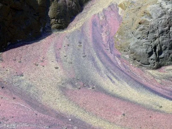 Các ngọn đồi xung quanh bãi biển Pfeiffer ở Big Sur, California rất giàu mangan ngọc thạch lựu. Sau những năm tháng dài bị rửa trôi, chúng tạo nên một bãi cát chảy lấp lánh màu tím pha lẫn chút hồng và xanh.
