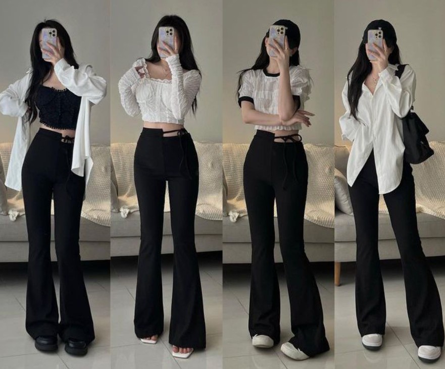 - Dáng người phù hợp: Phù hợp với dáng người chữ nhật (ít đường cong) và dáng người tam giác ngược (vai rộng) vì quần ống loe vải đen tạo ảo giác về đường cong hông và giúp cân bằng tỷ lệ cơ thể.