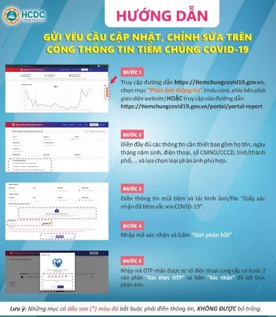 Trường hợp đã tiêm nhưng chưa có thông tin xác nhận, hoặc thông tin hiển thị sai, người dân có thể gửi phản ánh đến các đơn vị chuyên môn xử lý với tính năng gửi phản ánh trên Cổng thông tin Tiêm chủng COVID-19 để được điều chỉnh theo các bước như sau: