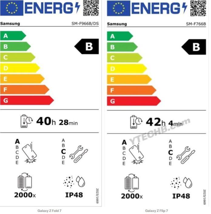 Tại thị trường EU, các nhà sản xuất phải dán nhãn năng lượng dễ đọc cho sản phẩm để giúp người mua lựa chọn các thiết bị tiết kiệm năng lượng hơn. Đối với điện thoại thông minh, nhãn năng lượng này bao gồm các thông tin bổ sung như dung lượng pin, độ bền pin và xếp hạng IP, cùng với điểm số về khả năng sửa chữa và khả năng chống rơi. Tài khoản mang tên Mystery Lupin trên mạng xã hội gần đây đã phát hiện ra nhãn năng lượng của Galaxy Z Fold 7, và trang tin YTECHB cũng tìm thấy các nhãn tương tự của Z Flip 7 và Z Flip 7 FE.