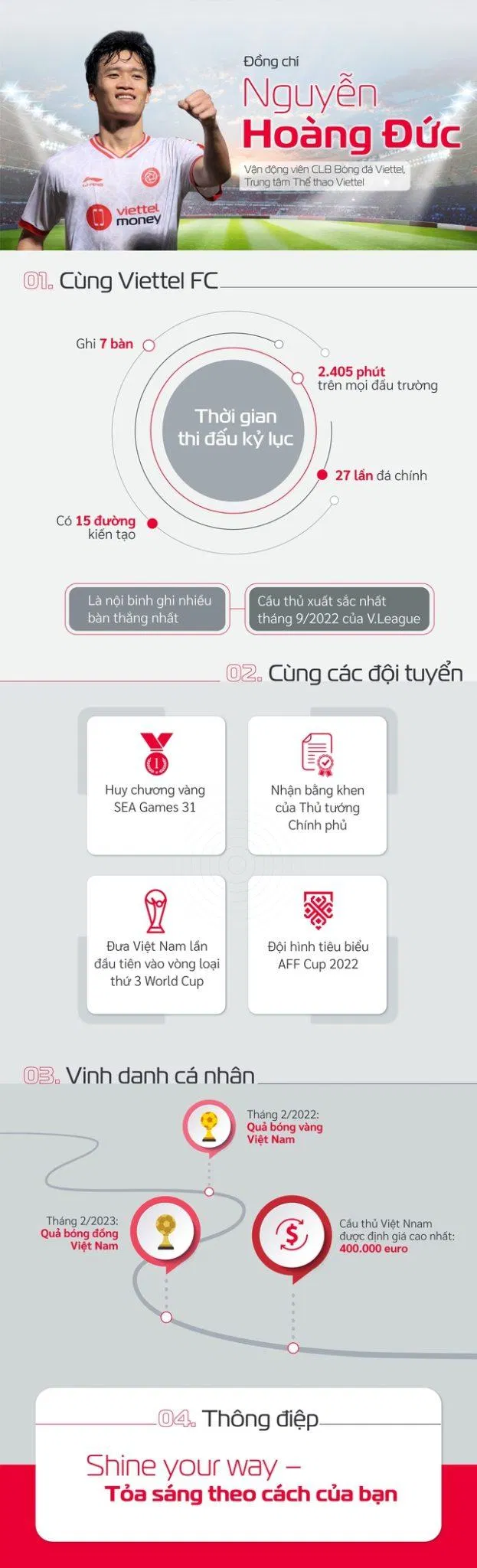 Năm nay, tổng số tiền thưởng Tập đoàn Viettel dành cho các cá nhân, tập thể xuất sắc là hơn 3,3 tỉ đồng. Cá nhân được vinh danh, ngoài tiền thưởng còn được nhận một chuyến công tác, học tập tại nước ngoài. Nguyễn Hoàng Đức vừa tập trung cùng đội tuyển Việt Nam dưới thời HLV Troussier. Anh là một trong những nhân tố chủ chốt của bóng đá Việt Nam trong hành trình chinh phục những đỉnh cao trong tương lai, trong đó có giấc mơ World Cup 2026.