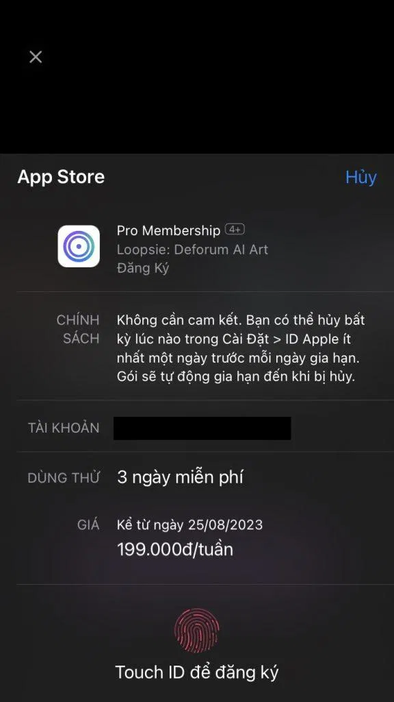 Bước 3: Sau khi bấm vào đăng ký, bảng thông tin thanh toán trên App Store hiện ra bạn cần xác nhận đăng ký để có thể trải nghiệm Loopsie Pro.